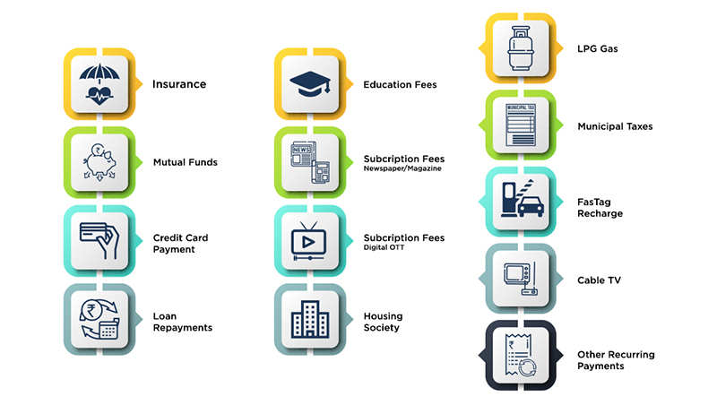 Bharat BillPay offers all recurring payments like electricity, telecom, DTH, Gas, water bills, Insurance, Loan repayments, Education fees, FasTag Recharge, Municipal taxes, Housing society, Subscription fees etc. at one single window.